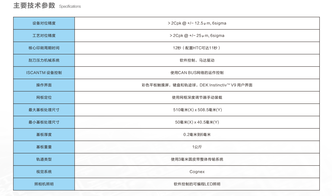 DEK Horizon 03iX印刷機:DEK Horizon 03iX特點:.先進的上視/下視視覺系統.獨立控制與調節的照明.高速度移動的鏡頭.高精度伺服馬達驅動及PC控制.自動、無輔助的網板底面清潔功